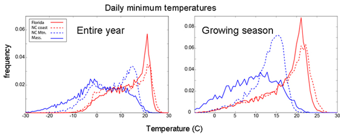 Annual distributions of daily minimum temperatures at field sites in Florida, coastal and montane North Carolina, and Massachusetts for the entire year and the growing season only. The growing season is defined as the period of the year between diapause termination and diapause initiation.