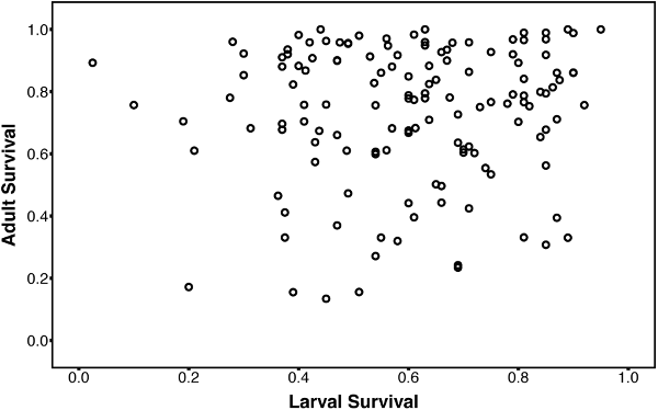 Tolerance of cold temperatures of adult flies from DGRP isofemale lines of Drosophila melanogaster is completely genetically decoupled (no genetic correlation with) from tolerance of larvae, another life history stage. Fig. 1 from Freda et al. 2017, ICB.