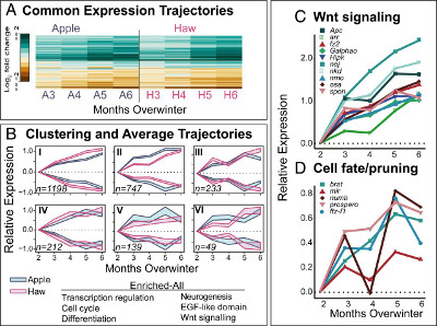 Life history traits related to seasonal timing can be hypervariable within species and evolve rapidly in the face of changing climates or during biological invasions. Like many key adaptive traits, life history timing is often highly polygenic, influenced by thousands (or hundreds of thousands!) of loci across the genome. A number of our studies illustrate how divergent natural selection on life history timing can drive divergence across the genome during ecological speciation. We have also shown how polygenic adaptation is mediate through diverse developmental processes setting life history timing in the field.